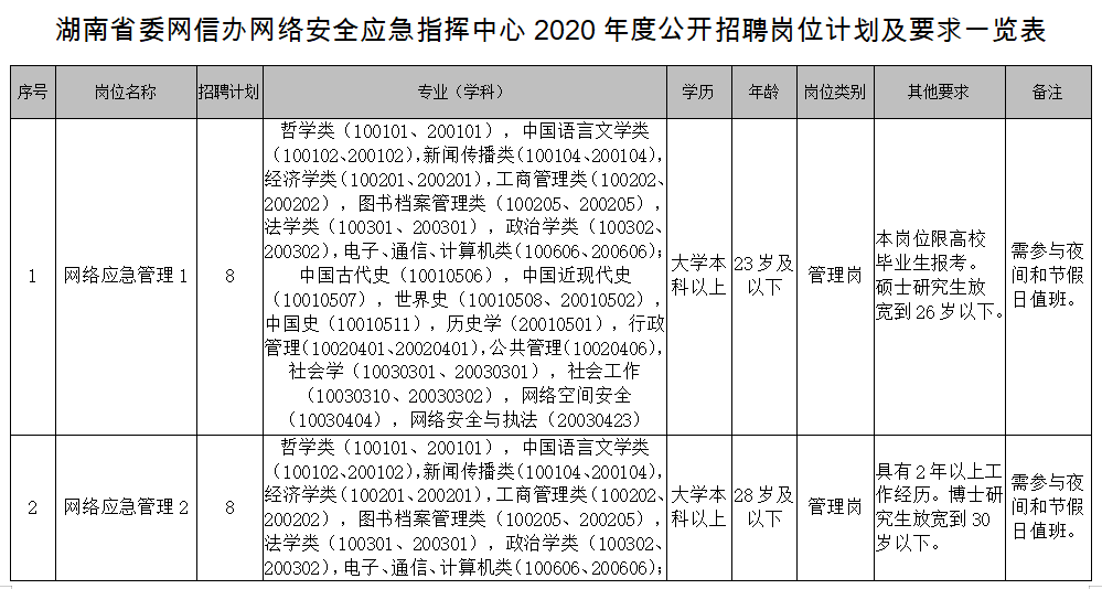 湖南省委网信办直属事业单位网络安全应急指挥中心招聘20名工作人员