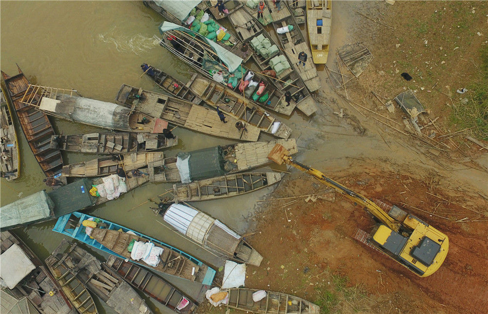 在湖南常德汉寿县蒋家嘴镇,工作人员在洞庭湖边驾驶挖掘机回收渔船(2019年12月17日摄,无人机照片)。新华社记者 薛宇舸 摄