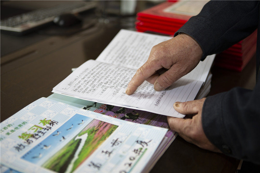 在鄱阳湖区一家候鸟救护站,一名护鸟员介绍他记录的湖区巡护工作日志(4月10日摄)。新华社记者 张浩波 摄