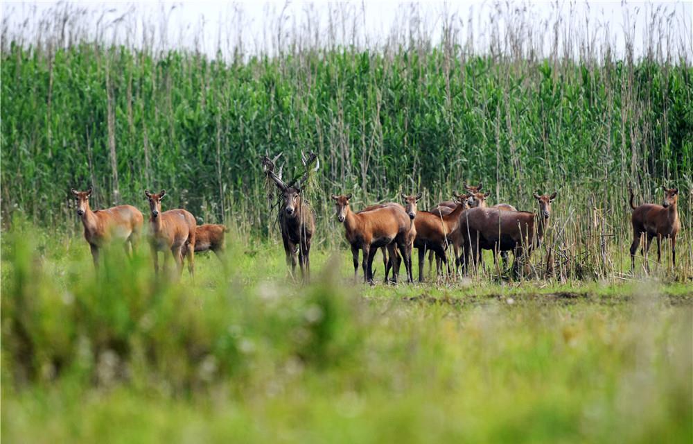 一群自然野化的麋鹿在湖南东洞庭湖国家级自然保护区内活动(2017年5月10日摄)。新华社记者 李尕 摄