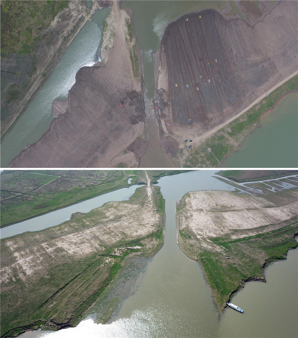 这是一张拼版照片。上图:2018年6月15日,大型机械在下塞湖矮围节制闸口作业(新华社记者丁春雨摄,无人机照片);下图:2019年3月12日,下塞湖矮围节制闸口经过爆破和清淤疏浚,堤坝已被铲平,堤外湖与堤内水连通(新华社记者陈泽国摄,无人机照片)。新华社发