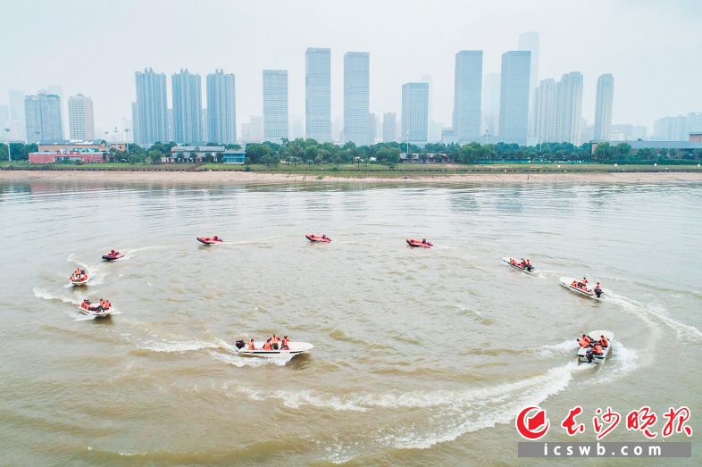 救援队队员和武警官兵驾驶舟艇在训练“O形救援”项目。长沙晚报全媒体记者 黄启晴 摄