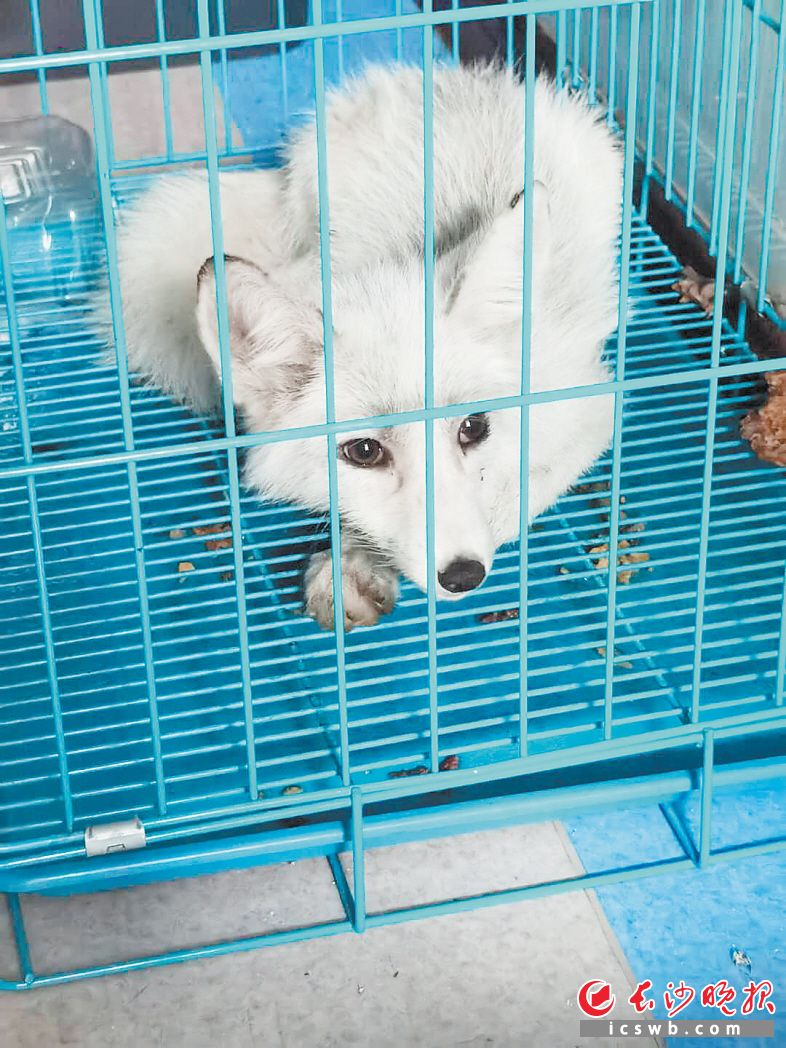 抓到狐狸后,民警们将它关进了笼子,他们本就想将它送到长沙生态动物园,但由于是周末,动物园没工作人员接收。于是,狐狸便被带往定王台派出所,在派出所度过了两天三夜。