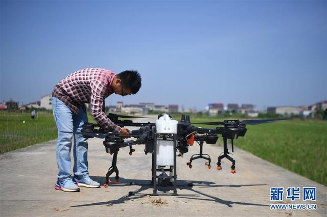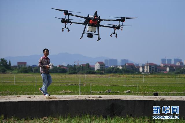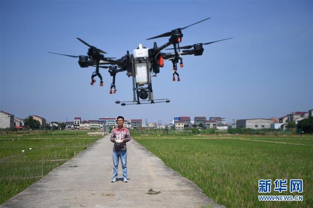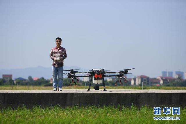 7月23日,夏胜在湖南省益阳市赫山区米香村的稻田旁操控无人机。 新华社记者 薛宇舸 摄