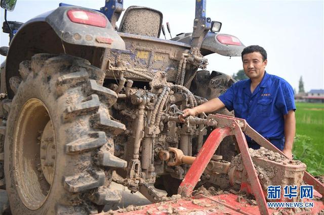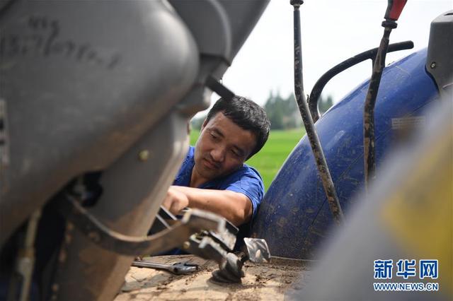 7月21日,汤烈辉在湖南省益阳市南县乌嘴乡东成村维修拖拉机。 新华社记者 薛宇舸 摄
