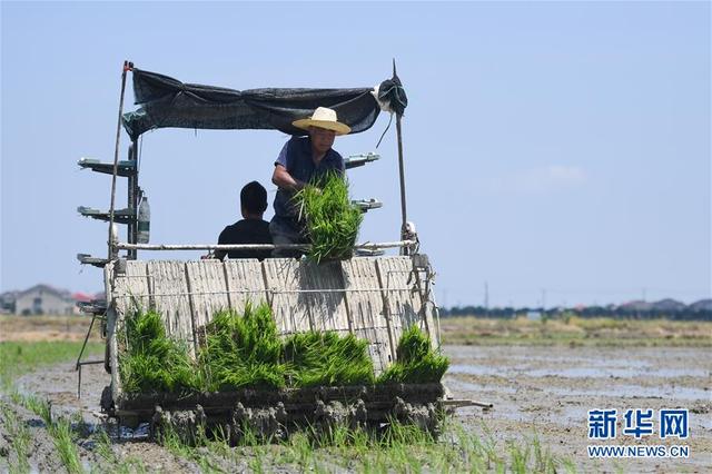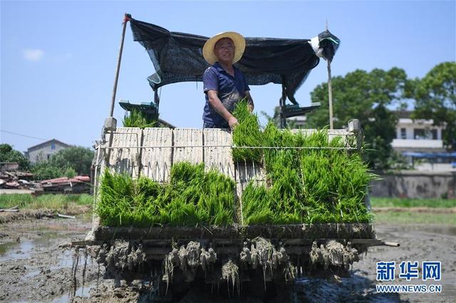 7月23日,冷德仁在湖南省益阳市赫山区米香村的稻田里与插秧机合影。 1954年出生于湖南省益阳市的冷德仁是益阳市赫山区邦得农机专业合作社一名熟练的喂秧手。双脚“外八字”站立于插秧机上,双手紧抓护栏保持平衡,观察秧轨上秧苗的数量,一旦秧轨中秧苗不足,冷德仁便要迅速提起身边的秧盘,左手在前将秧盘对准放入秧轨,右手前推完成喂秧,双手随即再次紧抓护栏,以防从颠簸的插秧机上掉下。这看似简单的操作,需要极有经验的喂秧手才能做到“快”“稳”“准”“狠”。过去,一个人一天才能抛秧1亩地,而一台插秧机一天能插秧20到30亩地。 新华社记者 薛宇舸 摄