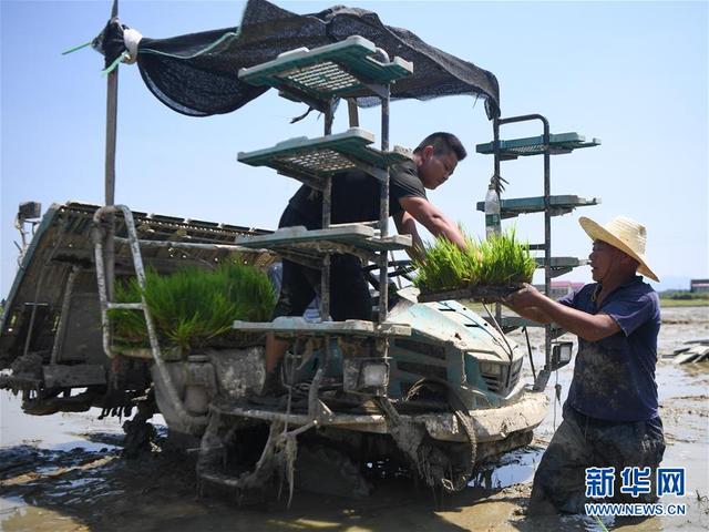 7月23日,冷德仁(右)在湖南省益阳市赫山区米香村的稻田里往插秧机上运输秧盘。 新华社记者 薛宇舸 摄