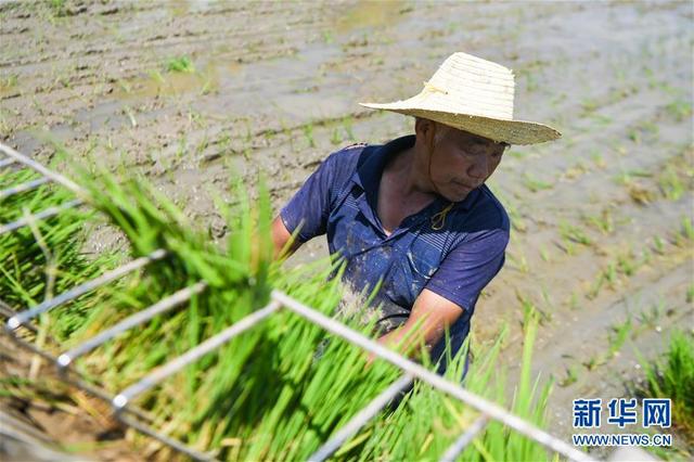 7月23日,冷德仁在湖南省益阳市赫山区米香村的稻田里给插秧机喂秧。 新华社记者 薛宇舸 摄