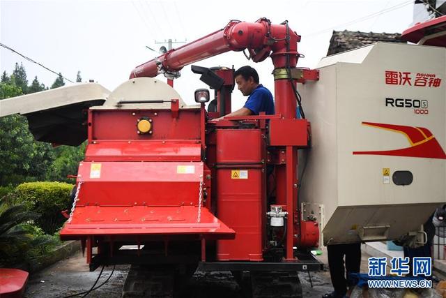 7月21日,汤烈辉在湖南省益阳市南县华阁镇同兴村维修收割机。 新华社记者 薛宇舸 摄