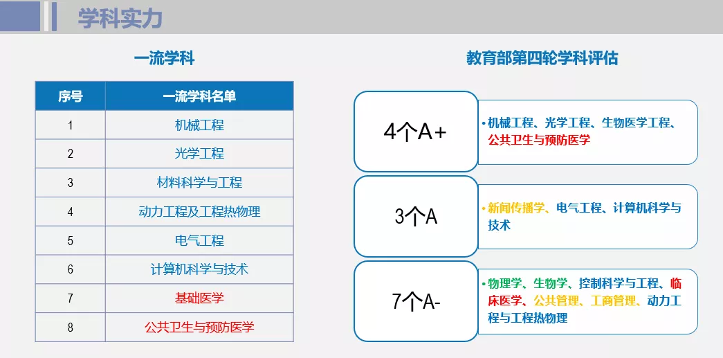 8个学科入选国家“一流学科建设”名单;在教育部第四轮学科评估中,14个学科获评为A类。其中机械工程、光学工程、材料科学与工程、动力工程及工程热物理、电气工程、计算机科学与技术、基础医学、公共卫生与预防医学为“一流学科”;机械工程、光学工程、生物医学工程、公共卫生与预防医学为A+学科;新闻传播学、电气工程、计算机科学与技术为A学科。