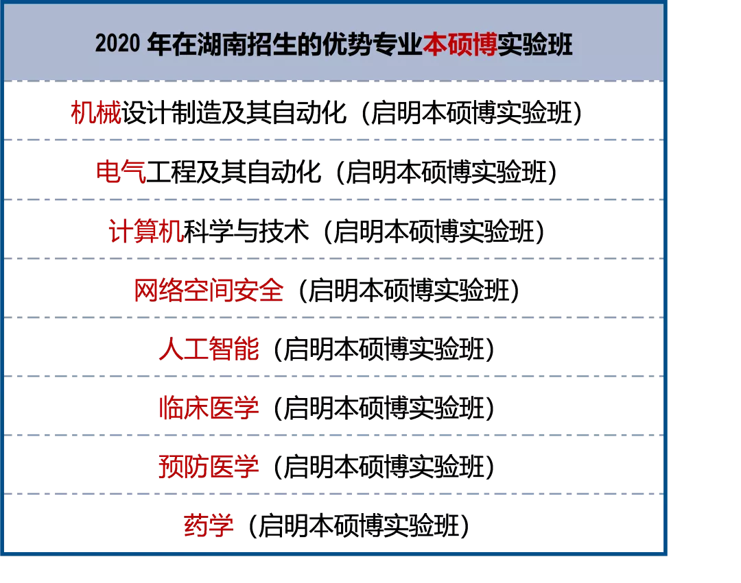 新增热门专业本硕博连读专业,除了传统的临床医学八年制以外,首次增加机械、电气、电子信息、计算机、网络空间安全、人工智能、预防医学、药学8个本硕博连读专业,在湖南投放的本硕博连读计划数22人,占湖南理科计划的5%。