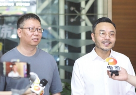 7月22日,担任影片《第一次的离别》总策划的汪涵(右)正在接受采访。图/记者张云峰