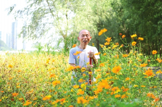 湘江株洲段,在以绿色为主调的风光带上,有一片明亮的橙黄格外引人注目,这是81岁的熊础坚花3年时间种下的一片波斯菊花田。
