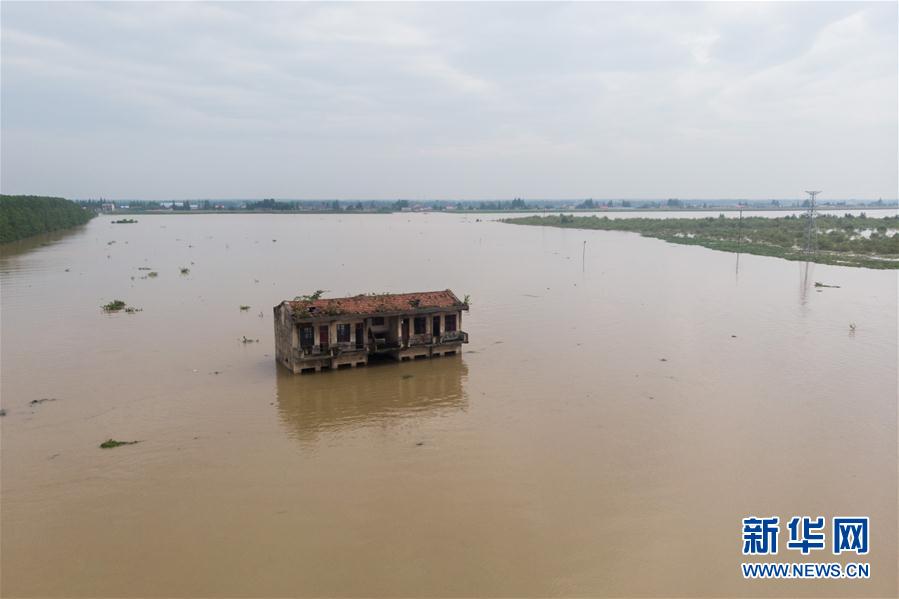 7月11日,在沅江市南洞庭芦苇场澎湖潭垸,一栋房屋被淹(无人机照片)。 新华社记者 陈思汗 摄