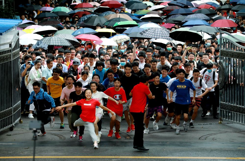 ↑7月8日,高考结束,考生们冲出长沙市一中考点大门后跃起。新华社记者 薛宇舸 摄