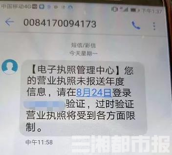 华声在线8月31日讯(三湘都市报·华声在线记者 杨洁规 通讯员 冯胜)如果你是一名企业主或个体工商户,收到一条“营业执照信息未报送行年报,及时点击某网址认证”的短信,你会立即点击认证还是谨慎求证呢?
