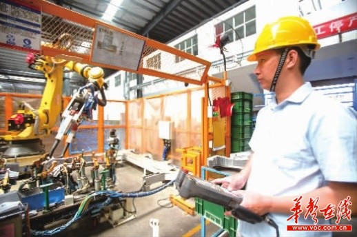 在长沙晓光模具公司的冲焊工厂,毛逢春熟练地在手持设备输入一串串指令代码,控制面前的机械手臂灵活抓取生产线上的毛坯料,秒变机器人“24小时全自动搬砖模式”,时而“低头”、时而“摆臂”、时而旋转“机身”。通过工业机器人在流水线上的协同工作,他轻松完成汽车部件流水槽焊接、加工等工序,整个过程行云流水、一气呵成。