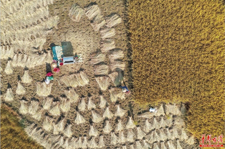 8月28日,道县仙子脚镇下坝洞村,农民在收割优质稻。近日,该村村民抢抓当前晴好天气抢收、抢晒水稻。蒋克青 摄