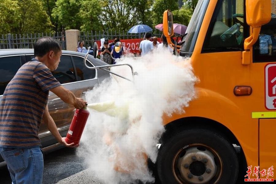 司乘人员首先对车门、车把手、座椅、车身等处依次进行消毒杀菌,确保车内公共区域全覆盖消杀,然后安全员对车内消防设施、安全锤等安全设备进行检查。在应急演练环节,模拟校车在行驶途中与其它车辆发生碰撞,车头发生火情,驾驶员立即靠边停车,打开安全门并用随车灭火器进行灭火,跟班安全员则迅速组织学生双手抱头有序疏散,一分钟内,车内人员全部撤离到安全地带。