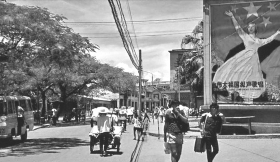 1980年的深圳东门老街,两个年轻人提着行李箱。
