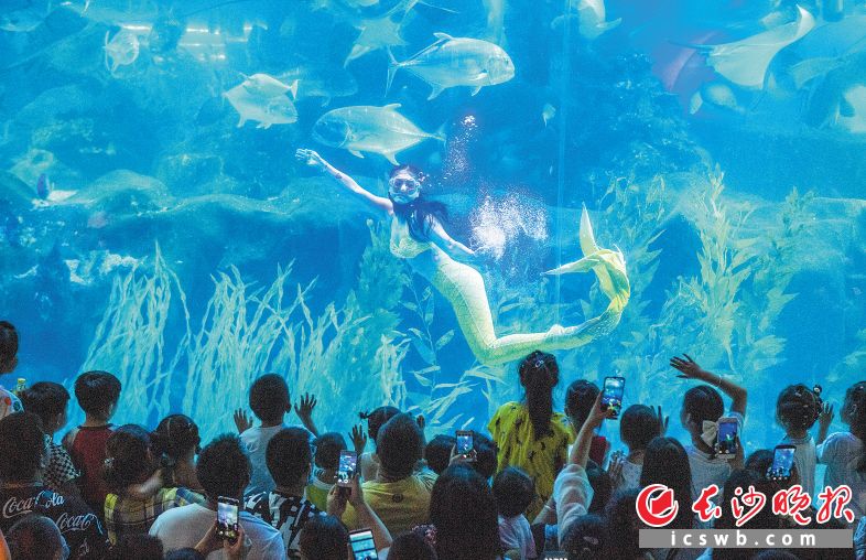 长沙海底世界,“美人鱼”的表演吸引孩子们拍手叫好。均为长沙晚报全媒体记者 邹麟 摄