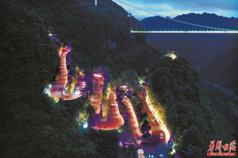8月21日晚,吉首市矮寨盘山公路上流光溢彩,犹如一条璀璨的巨龙蜿蜒盘旋在深山之中。该公路亮化工程是吉首市旅游景区提质增辉的亮点工程。夜晚的百年公路奇观“矮寨天险”与矮寨大桥遥相辉映,赏心悦目。