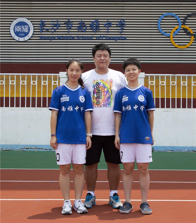 长沙市南雅中学女足朱教练邓毅与队员汤雯萱(左)、黄哲宁(右)合影。