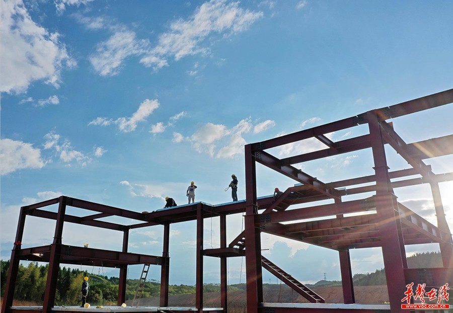 8月20日,资兴市旗滨中性硼硅医药玻璃项目建设工地,工人在进行钢架厂棚施工。该项目预计今年底可竣工试产,将打造全国中性硼硅玻璃及医药包装材料生产基地。