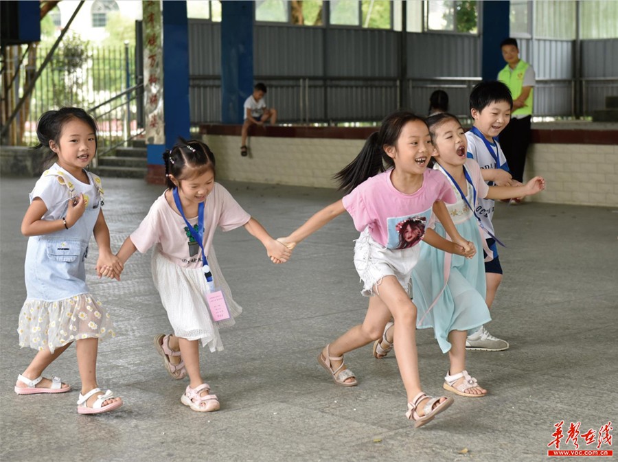 8月19日,蓝山县塔峰镇三蓝社区,孩子们在志愿者的陪伴下玩游戏。连日来,该县组织大学生志愿者为留守儿童和贫困户子女免费进行科普、安全、急救、书画等知识免费培训,开展趣味游戏互动,丰富孩子们的假期。