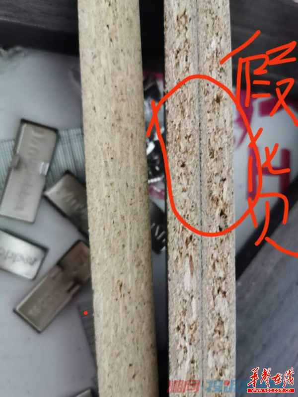 曾女士质疑两块9毫米的刨花板粘贴而成的18毫米非进口欧松板。(曾女士 供图)