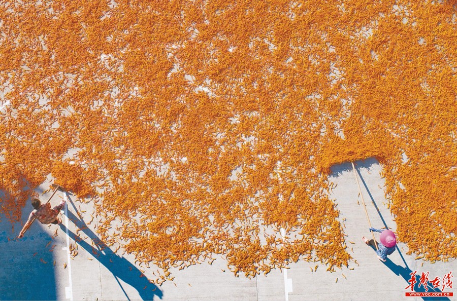 8月15日,通道侗族自治县双江镇马家坝村,村民在操场上晾晒小黄椒。连日来,该村村民趁着晴好天气,忙着采摘、晾晒辣椒等农产品,屋前屋后呈现出一幅幅生动多彩的秋收画卷。