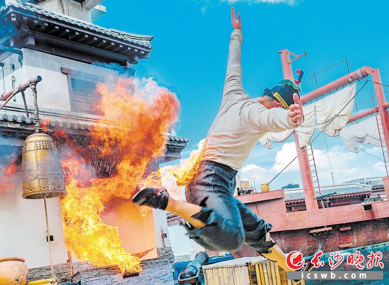 长沙晚报8月11日讯(全媒体记者 朱华 实习生 郑晓雪)10日下午2时许,正是一天最炎热的时段,然而新华联铜官窑古镇内的黑石号剧场却座无虚席,一场再现当年“黑石号”商船扬帆出航、与海盗搏斗的实景特技秀正在室外上演。火焰爆炸、高台跳水、钢丝滑翔、水面特技……24分钟里,精彩环节一环扣一环,观众如潮的掌声一波又一波,欢声笑语不断。