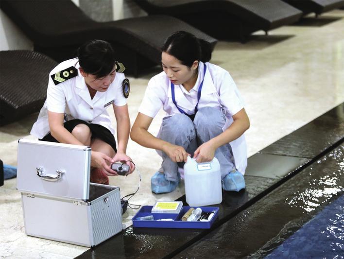 昨日上午10点,记者跟随市卫生计生综合监督执法局的工作人员,来到岳阳大酒店内的游泳馆。卫生监督员首先对游泳馆内查验健康码、测量体温等疫情常态化防控措施落实,泳池水质循环净化、消毒,水质自检、从业人员健康体检等情况进行检查。随后卫生监督员协同市疾控工作人员对该单位泳池水质现场进行采样。据介绍,按照2019年11月1日开始实施的《公共场所卫生指标及限值要求》,人工游泳池浑浊度应小于或等于1NTU,PH值控制在7.0-7.8,泳池水游离性余氯控制在0.3-1.0mg/L。