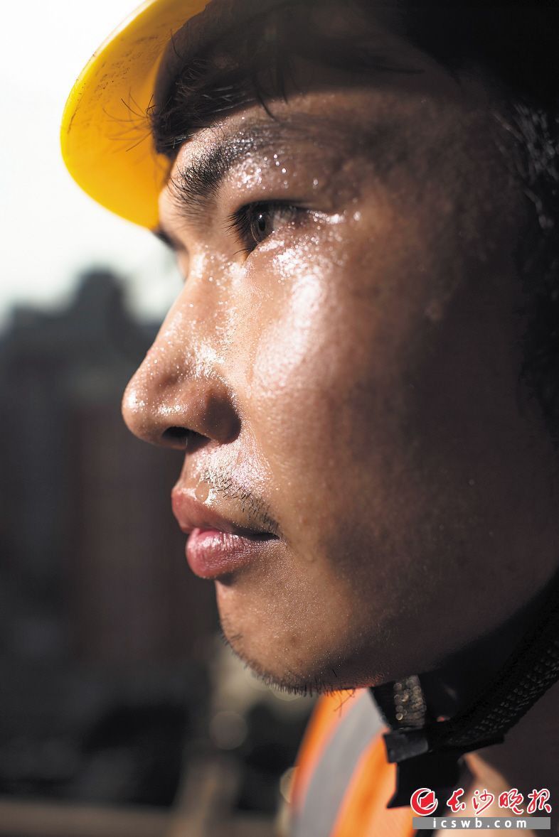 “天气炎热,不休息好是不行的。”夏季气温高,丁畅的上班时间也提前到了每天6时。从一开始出来工作,他接触的就是高空作业,跟师傅学“本事”。“现在早就不怕了,习惯了。”丁畅这次施工的大楼总高度262米,他所在的地方距离地面约100米。百米高空,他如履平地。技术娴熟的他在几块钢板之间穿梭,犹如一名高空舞者。长时间在户外高温条件下工作,丁畅的脸上满是汗珠,汗水顺着安全帽带子一滴滴流下来,他也顾不上擦。