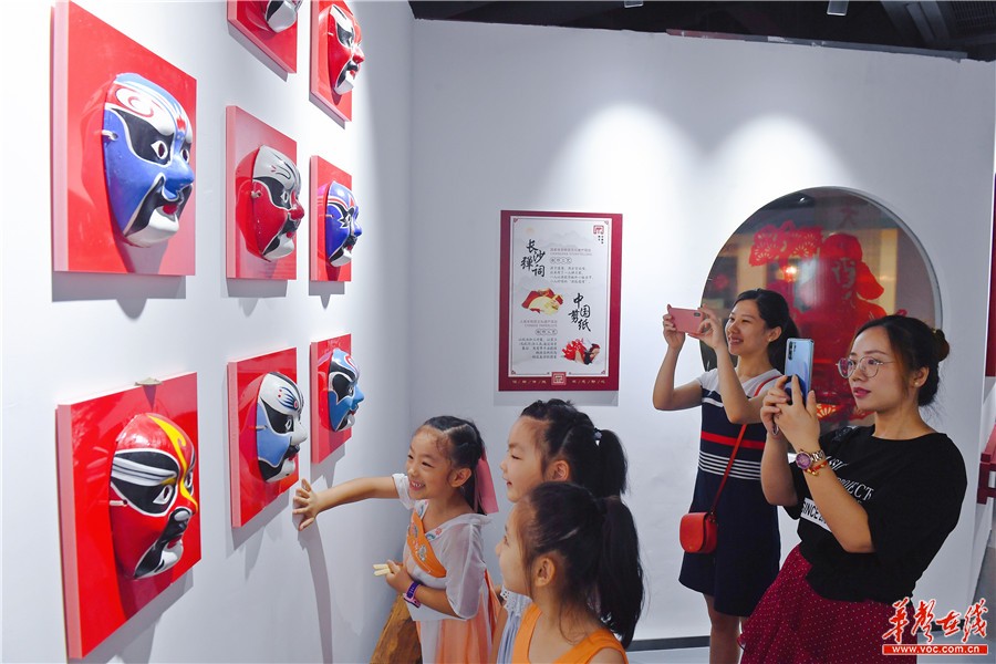 8月2日,市民在湖南雨花非遗馆参观湘剧脸谱。暑期以来,该馆每天迎来众多市民参观体验,大家通过了解非遗项目、观看非遗展演、亲身体验非遗技艺,近距离感受非遗的魅力。