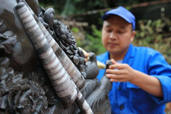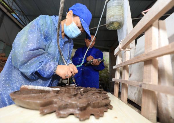 9月21日,在湖南省张家界市桑植县化石石雕生产性保护示范基地,雕刻技师对制作完工的石雕进行美化加工。