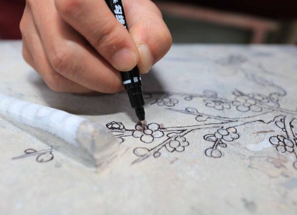 9月21日,在湖南省张家界市桑植县化石石雕生产性保护示范基地,雕刻技师在化石上绘制雕刻图案。