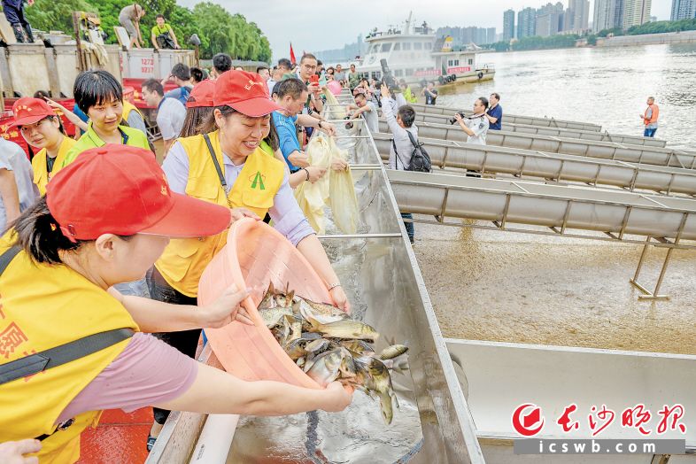 每年,环保志愿者、社会各界群众一起参加增殖放流活动,将优质鱼苗放归湘江,践行环保理念。长沙晚报全媒体记者 陈飞 摄