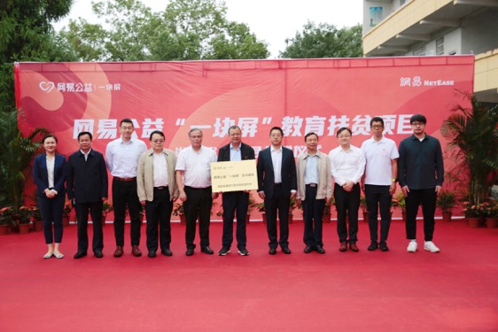 9月22日,网易公益“一块屏”教育扶贫试点基地捐赠仪式在湖南省邵阳县玉田中学举行。湖南省政协副主席张灼华、湖南省委网信办副主任屈贵全、网易集团党委书记周骏、网易有道副总裁金磊、网易传媒副总编辑肖雄、湖南省邵阳市和邵阳县领导,以及玉田中学校领导等出席了该捐赠仪式。