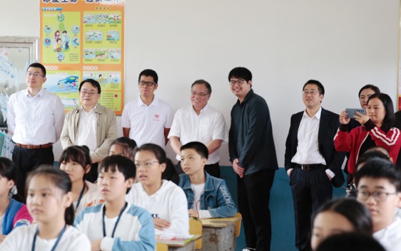 (湖南省政协副主席张灼华(左四)在网易集团党委书记周骏、网易有道副总裁金磊等陪同下参观教室)