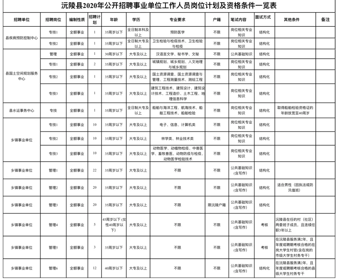 招聘计划:计划招聘事业单位工作人员120名,具体的招聘岗位、资格条件等详见:沅陵县2020年公开招聘事业单位工作人员岗位计划表