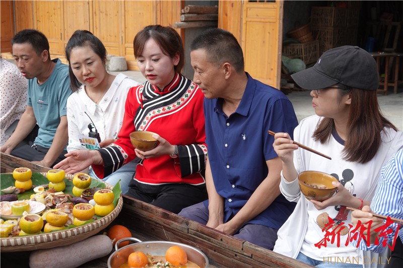 直播中,船型的长桌上摆满了各色美食,其中脐橙火锅最为吸引人——这便是远近闻名的比耳村脐橙宴。看着脐橙宴上的美食,听着脐橙宴的由来,最后好客村民和游客一起邀请美女记者与大家分享了一顿美味佳肴,吃了美食,了解了文化,气氛其乐融融。