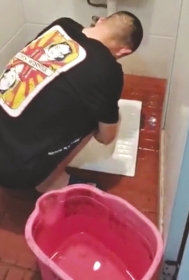 男子洗“霸王脚”刷厕所抵账