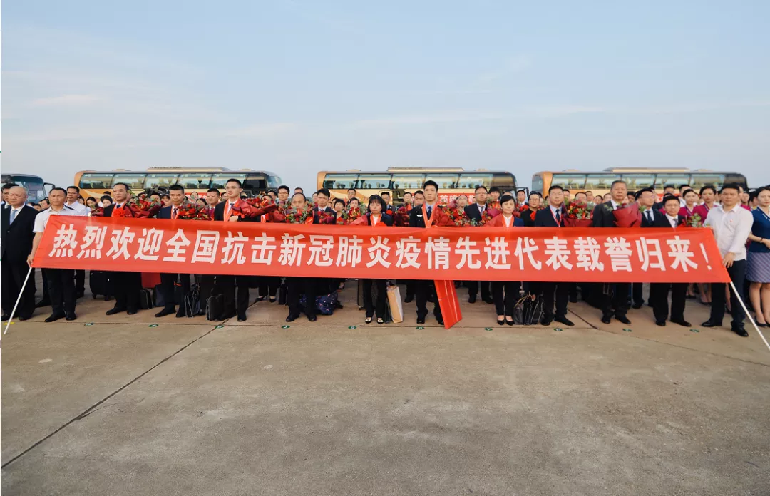 下午5时55分,湖南出席全国抗击新冠肺炎疫情表彰大会的全体代表搭乘南航CZ2016次航班,平稳降落在长沙黄花国际机场。长沙黄花机场举行民航界最高礼仪级别的“过水门”仪式欢迎抗疫英雄载誉归来!