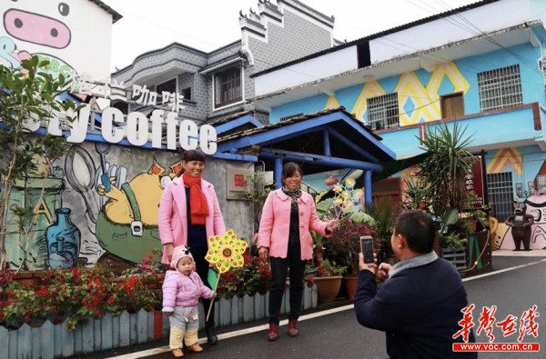 游客在香零山村网红打卡景点“猪栏咖啡”拍照留念