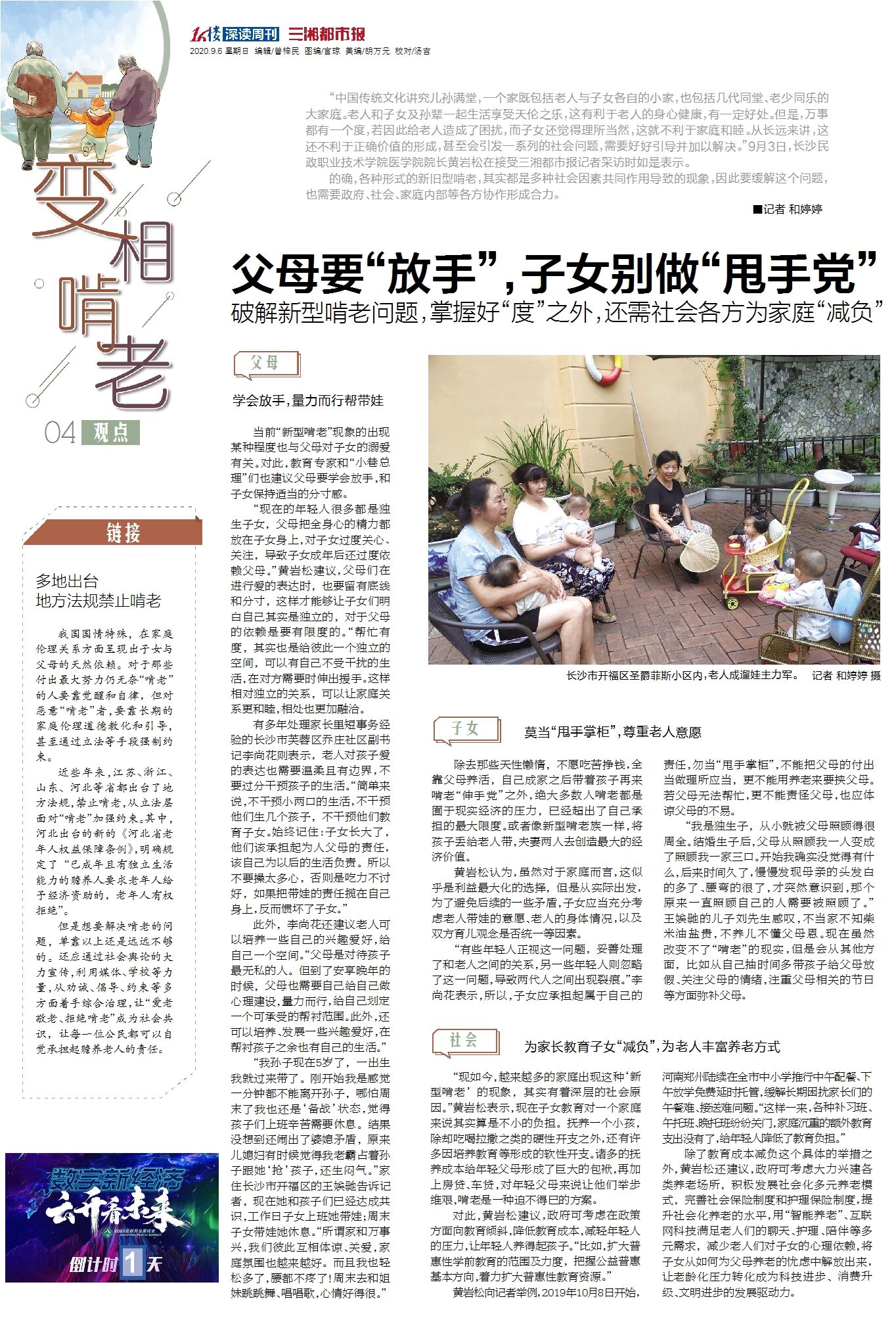 “中国传统文化讲究儿孙满堂,一个家既包括老人与子女各自的小家,也包括几代同堂、老少同乐的大家庭。老人和子女及孙辈一起生活享受天伦之乐,这有利于老人的身心健康,有一定好处。但是,万事都有一个度,若因此给老人造成了困扰,而子女还觉得理所当然,这就不利于家庭和睦。从长远来讲,这还不利于正确价值的形成,甚至会引发一系列的社会问题,需要好好引导并加以解决。”9月3日,长沙民政职业技术学院医学院院长黄岩松在接受三湘都市报记者采访时如是表示。