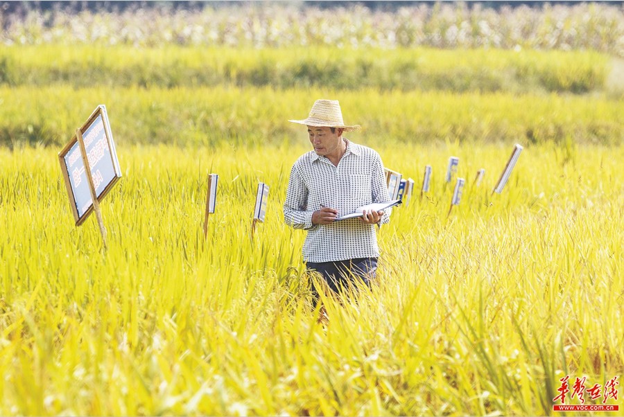 9月1日,龙山县石羔街道干比社区试验田,科技人员在观察和记录水稻成熟期的生长状况。这次进行的水稻栽种试验属湖南省水稻省级品种区域试验,约300个水稻品种,占地约150余亩稻田,在该县石羔街道干比社区和泗坪村分两片进行。曾祥辉 摄