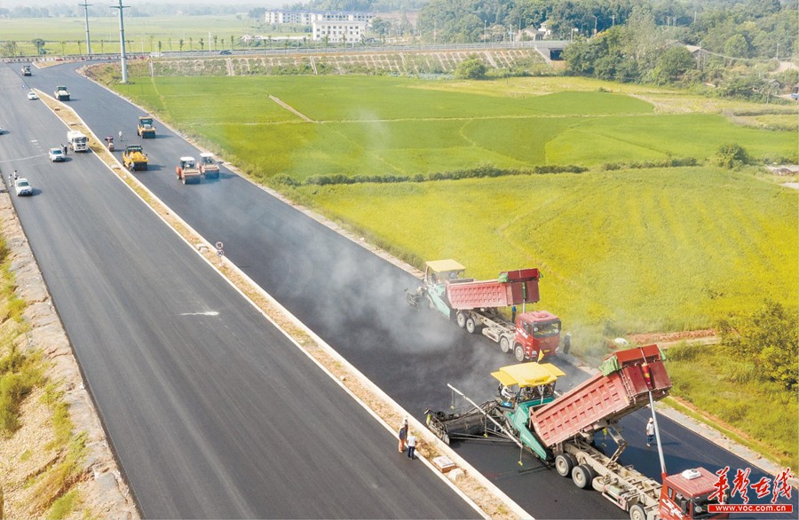8月31日9时30分许,桃源县桃源大道施工现场,工人们顶着烈日铺设路面油砂。该大道是沅澧快速干线第四大道,北接柳叶大道,南连桃源火车站,全长28.08公里,设计时速为80公里,于2017年开始动工。目前,主体工程已接近尾声,将于今年国庆节建成通车。周桂成 摄