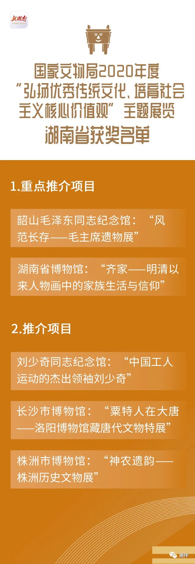 就在本次文物博览会上,发布了“十三五”湖南省十大考古新发现名单、全省博物馆十大精品陈列精品名单、湖南文物保护利用创新百佳案例名单、国家文物局2020年度“弘扬优秀传统文化、培育社会主义核心价值观”主题展览湖南省获奖名单等一系列重磅名单。