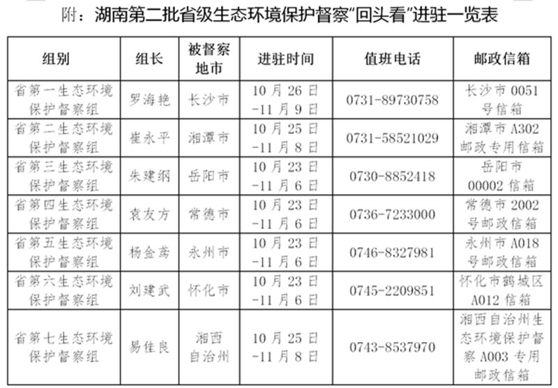 根据安排,湖南第二批省级生态环境保护督察“回头看”进驻时间约为15天。进驻期间,各督察组分别设立专门值班电话和邮政信箱(详见附表),受理被督察对象生态环境保护方面的来信来电举报,受理举报电话时间为每天8:00-18:00。